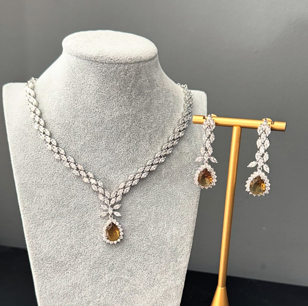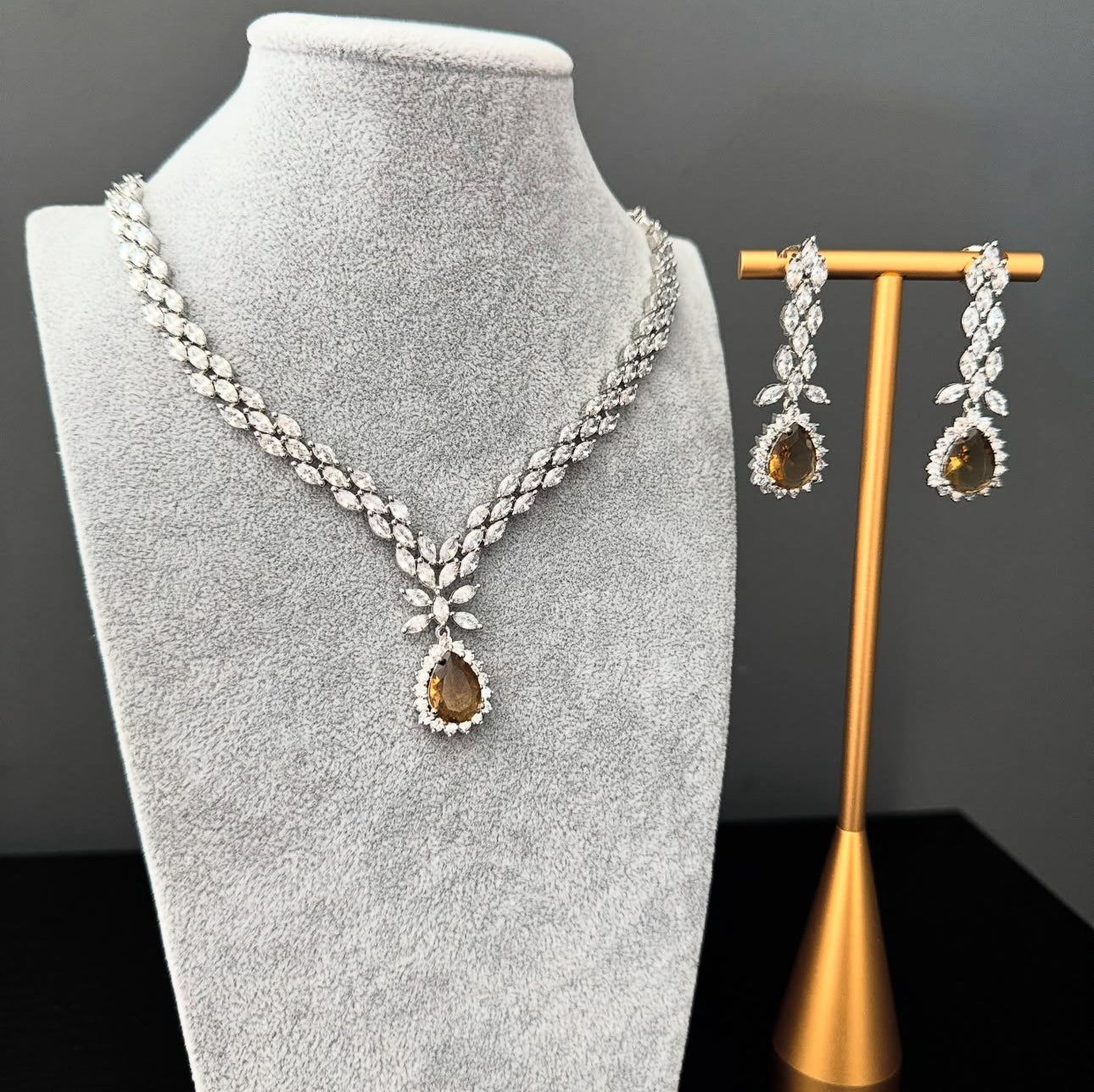 Effortlessly elegant, Ash Brown drop features a graceful cascade of brows-hued American diamond drop in a single string. A soft shimmer that speaks volumes — perfect for soirées, sangeets, and everything in between.