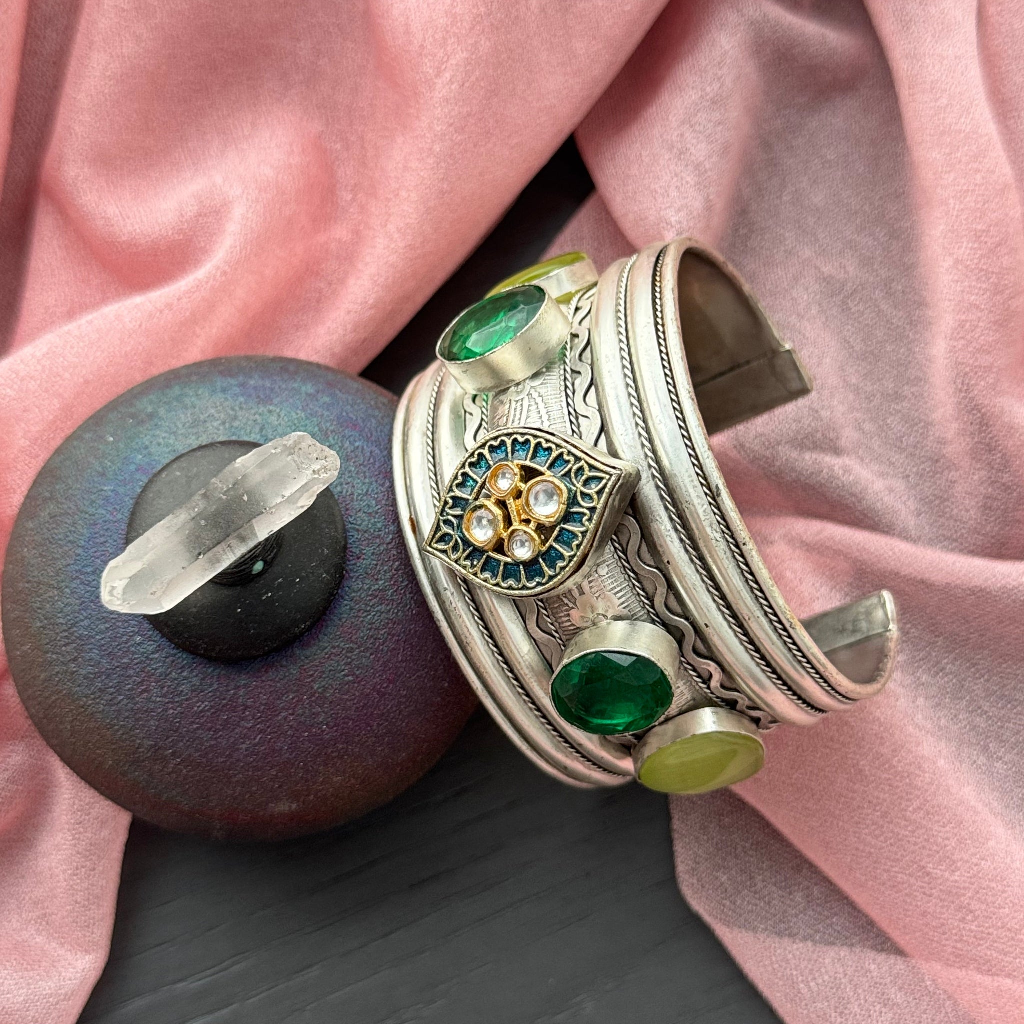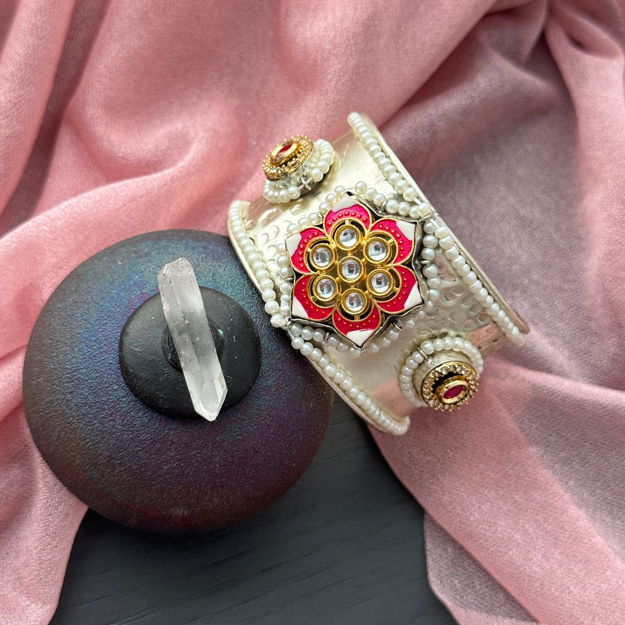 This bracelet features silver plated brass and kundan, and is offered in a single, adjustable size, making it a versatile addition to any jewelry collection. It is sold as an individual piece, making it an exclusive accessory for any ensemble.