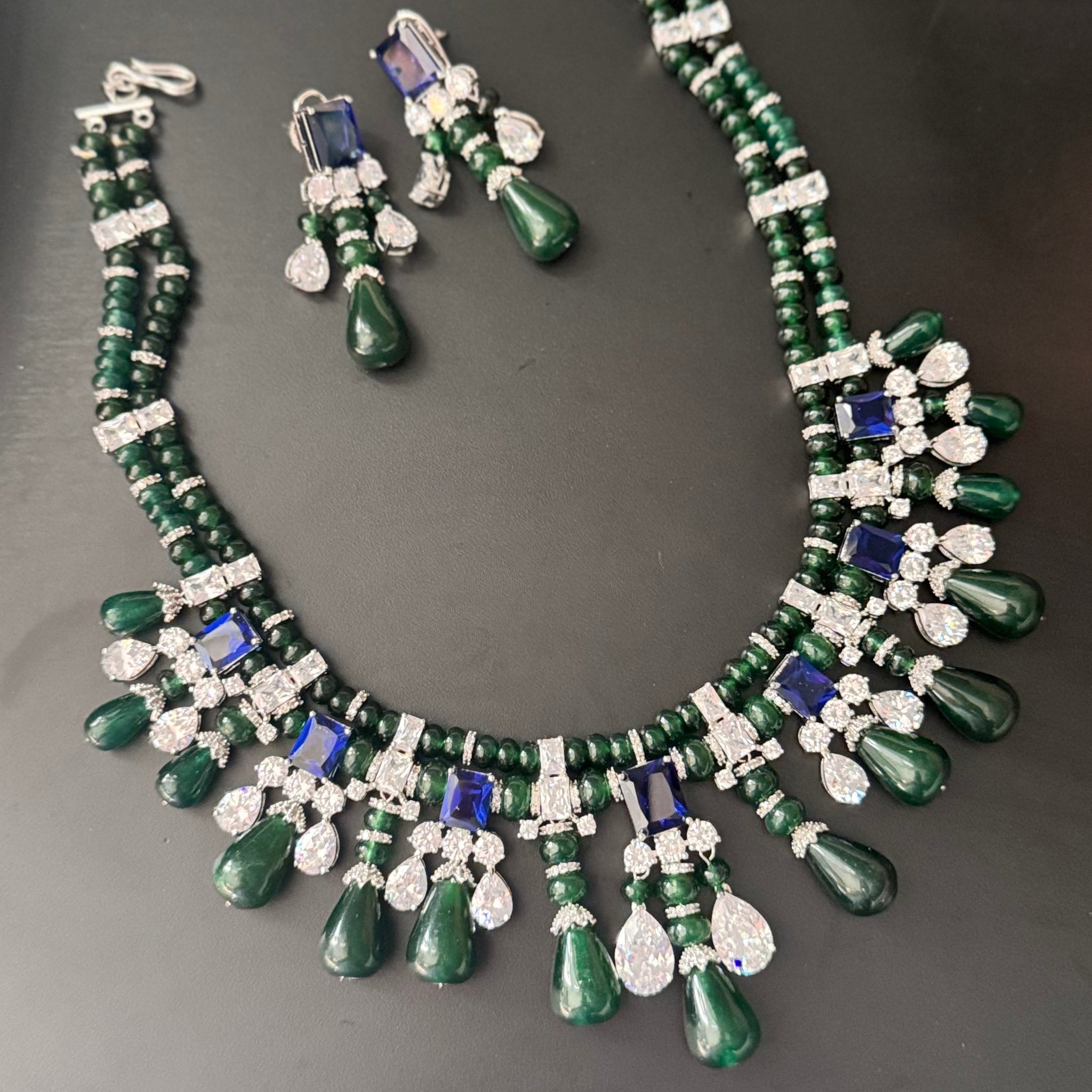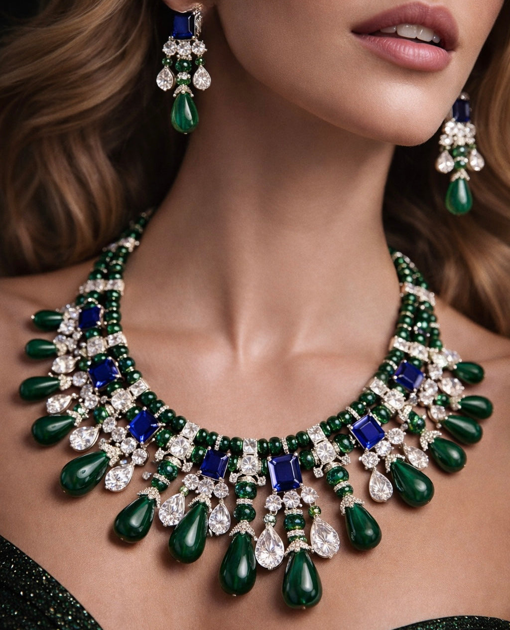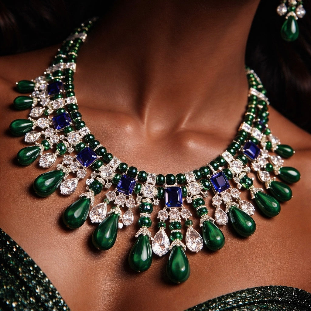 - Design: Intricate bib-style necklace featuring a harmonious blend of emerald-hued beads, striking sapphire-blue square-cut gemstones, and an array of brilliant clear round and pear-cut accent stones, culminating in lustrous green teardrop pendants.