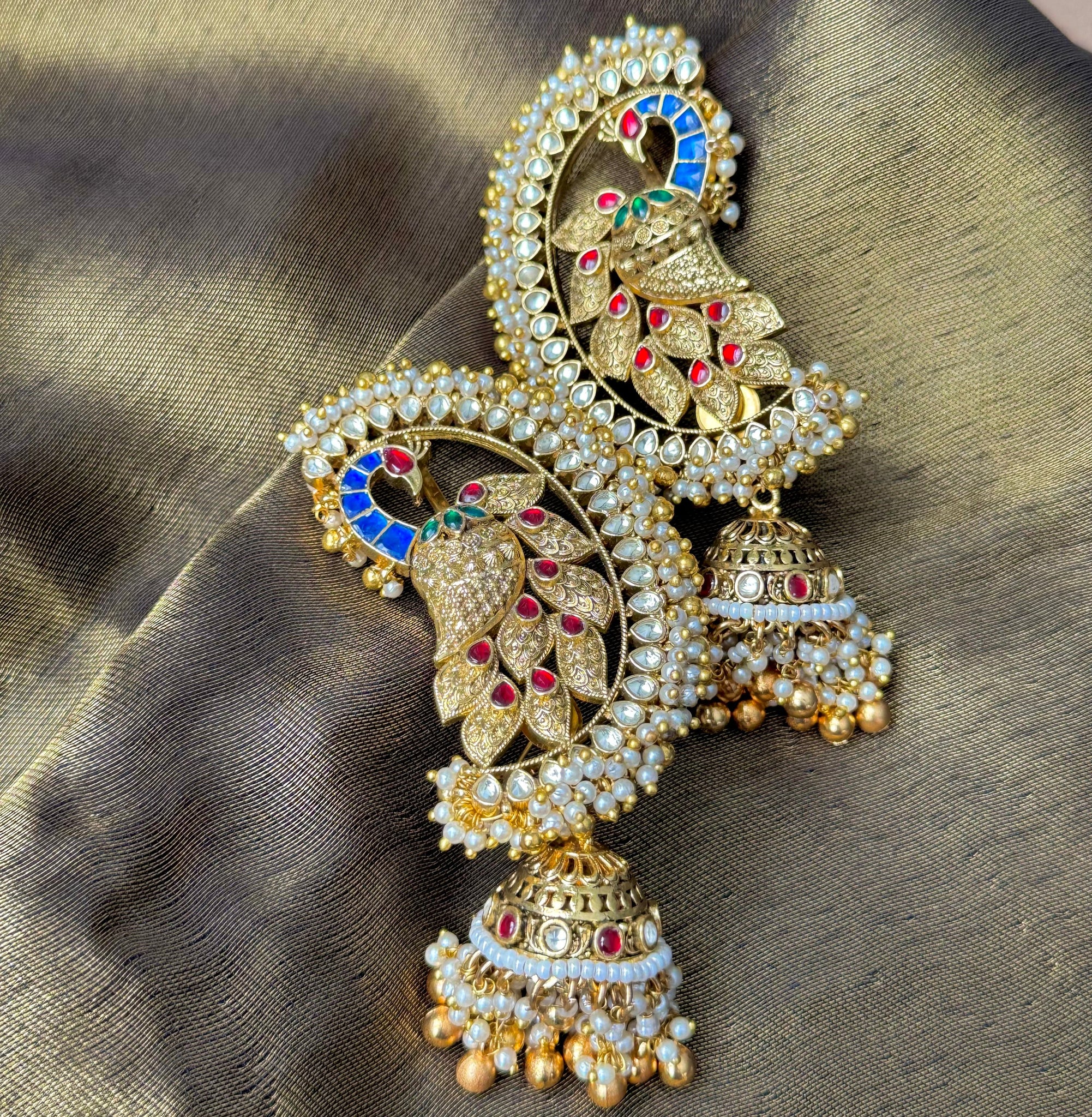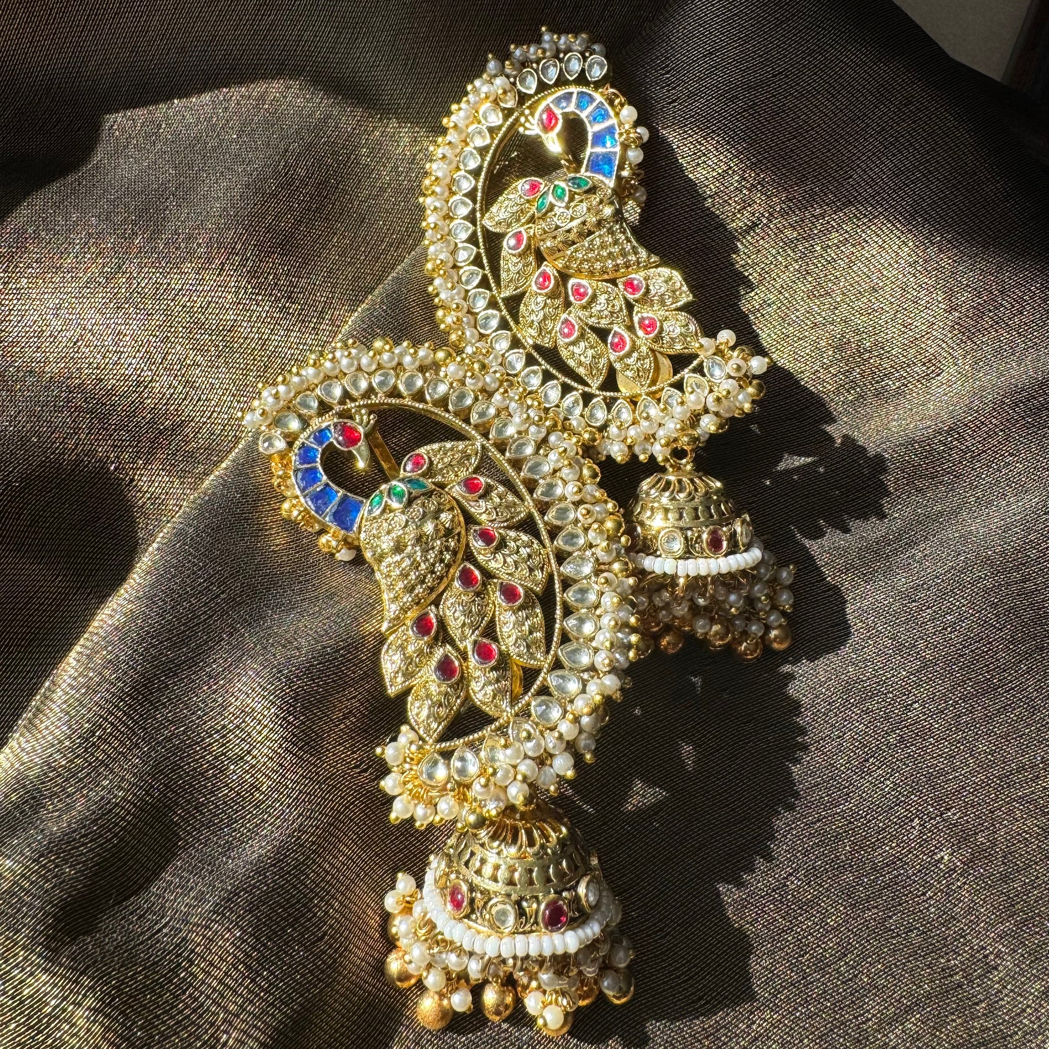 Renowned for our Kundan craftsmanship, these Jadtar Peacock Ear Cuff Earrings capture the timeless allure of Indian heirloom jewelry. Each gemstone is set with precision, secured with durable brass, and finished in rich gold plating for a regal touch. Inspired by the elegance of the peacock, this statement design blends heritage artistry with modern wearability. Perfect for weddings, festive occasions, or elevating everyday style, these earrings embody the essence of affordable luxury while honoring centuries of tradition.