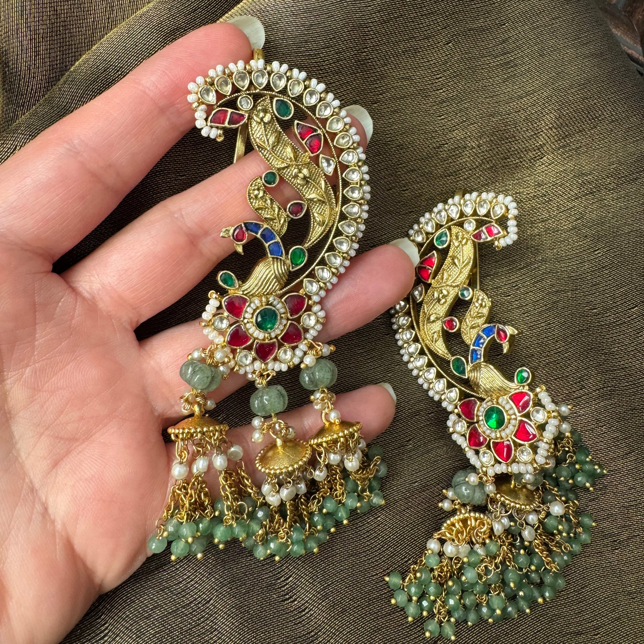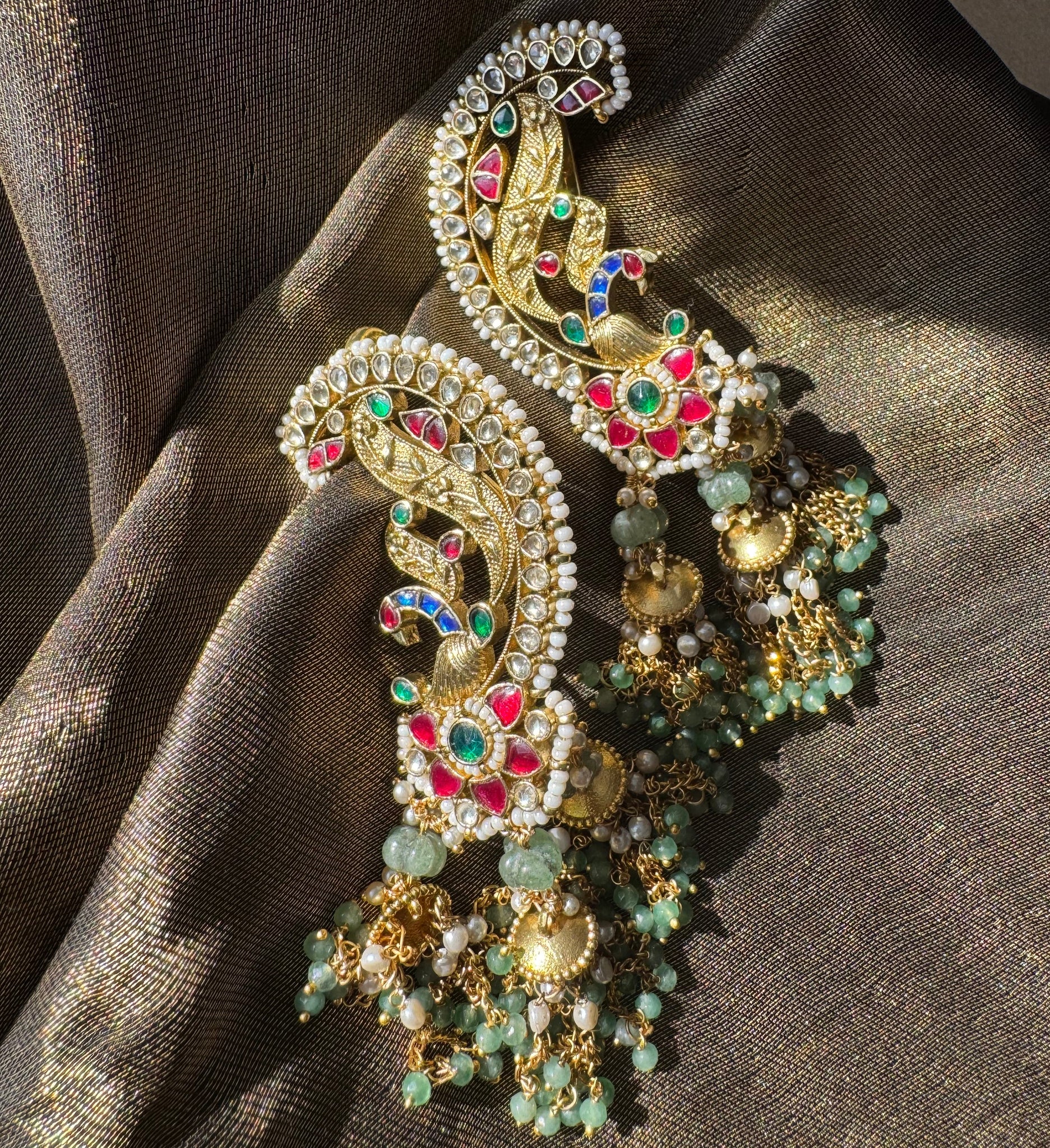 Renowned for our Kundan craftsmanship, these Jadtar Peacock Ear Cuff Earrings capture the timeless allure of Indian heirloom jewelry. Each gemstone is set with precision, secured with durable brass, and finished in rich gold plating for a regal touch. Inspired by the elegance of the peacock, this statement design blends heritage artistry with modern wearability. Perfect for weddings, festive occasions, or elevating everyday style, these earrings embody the essence of affordable luxury while honoring centuries of tradition.