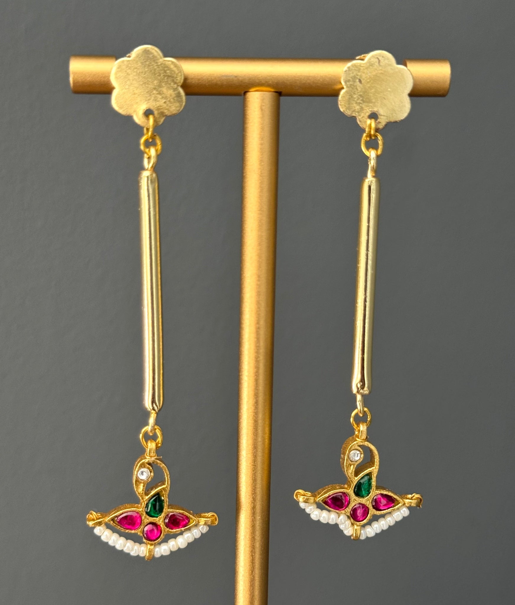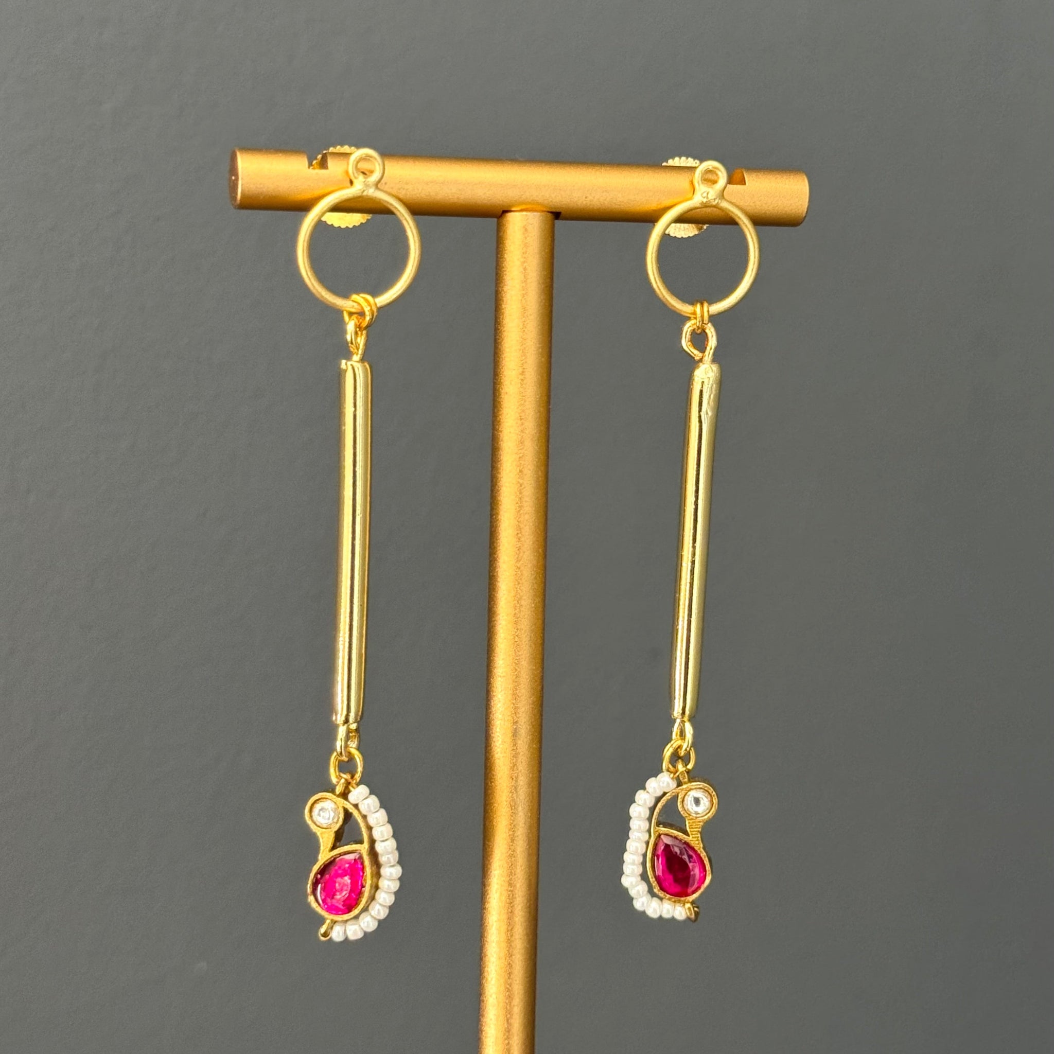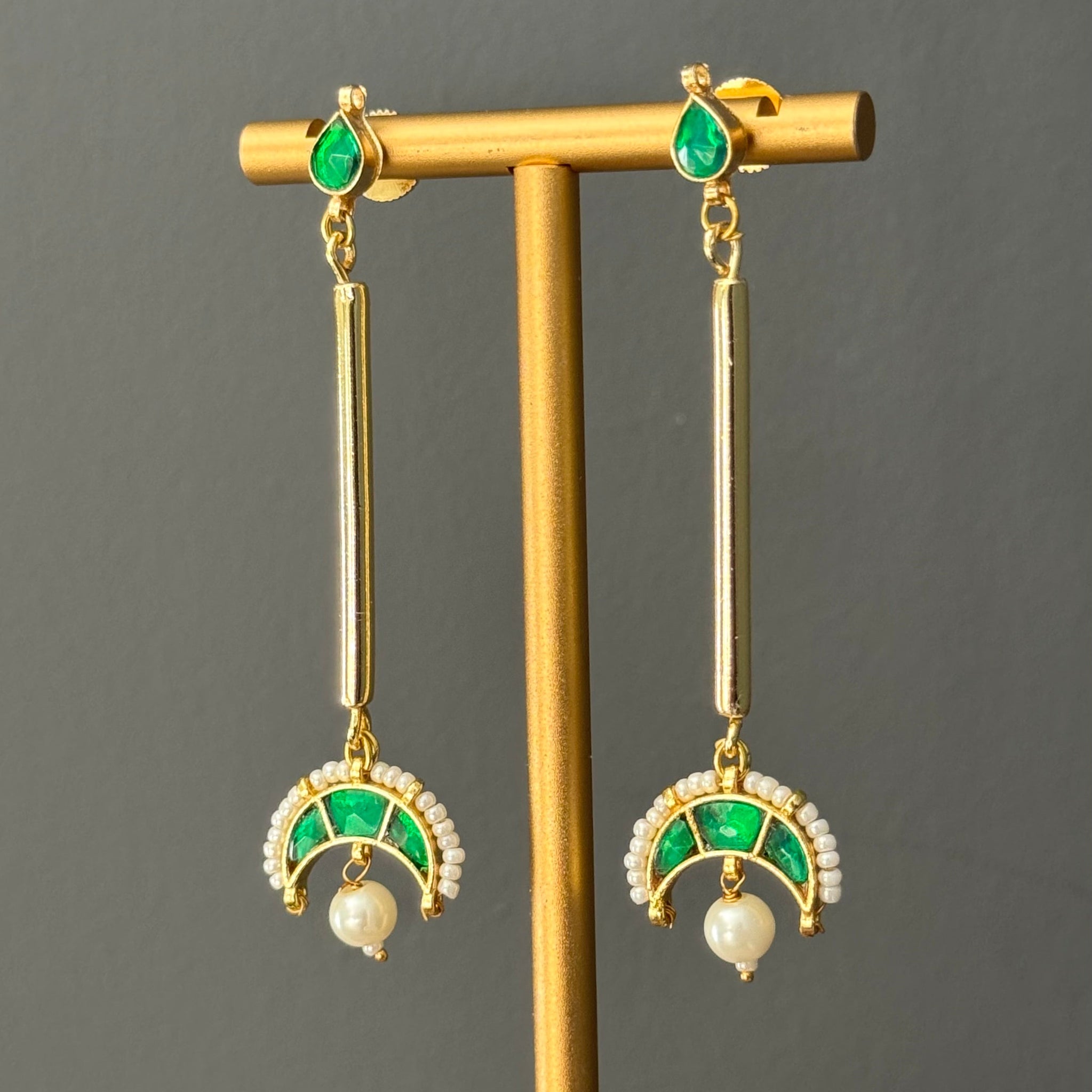 Elevate your look with these elegant gold-plated stick earrings, crafted in high-quality brass and adorned with luminous faux kundan stones. Designed to make a refined statement, the sleek vertical silhouette is balanced with a delicate crescent motif, pearl accents, and kundan detailing—perfect for modern elegance with a heritage touch.