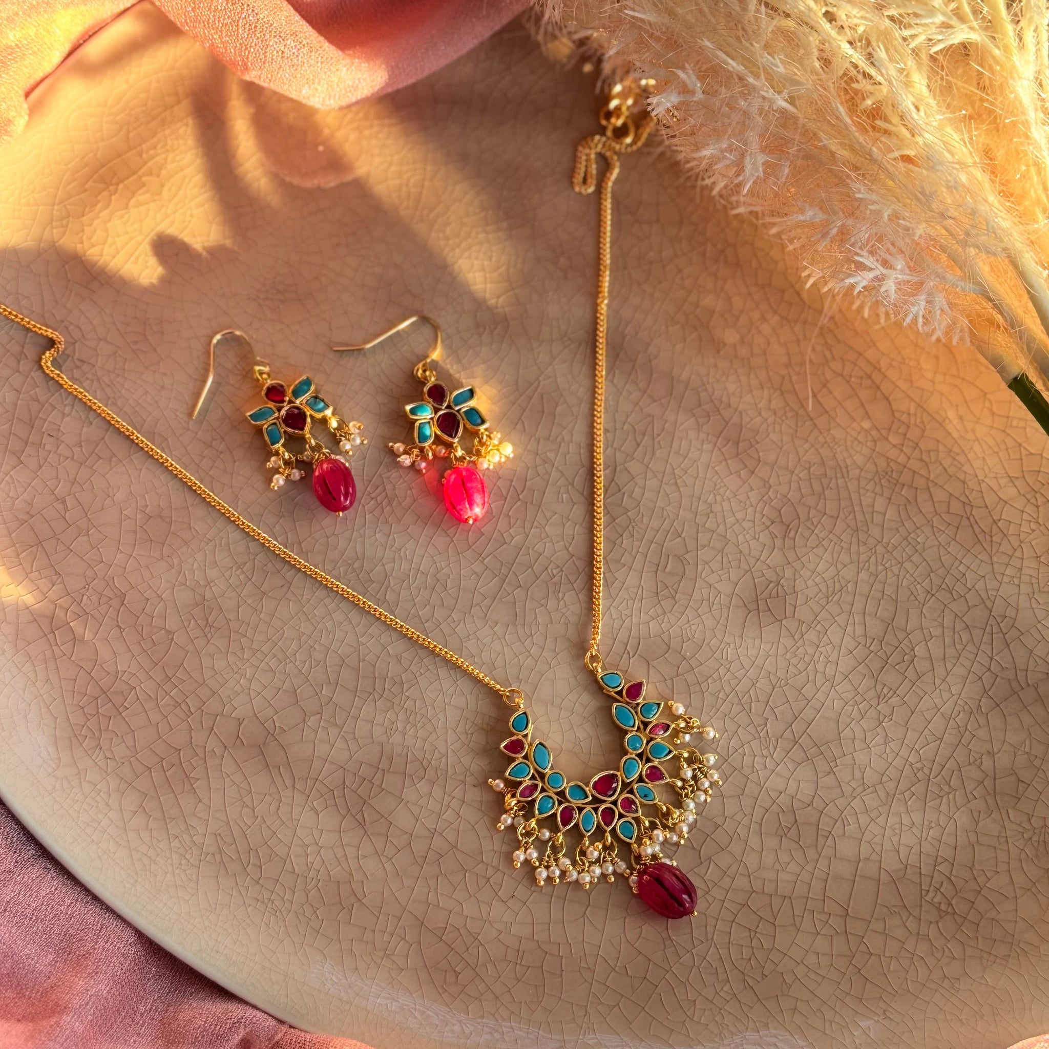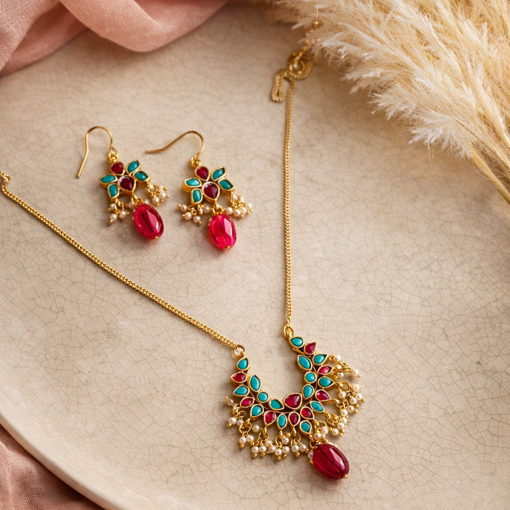 This minimal heritage Jadtar Kundan pendant set is a refined expression of timeless Indian craftsmanship. Featuring delicately hand-set phiroza and ruby stones, the design balances traditional artistry with a light, contemporary sensibility. The graceful pendant is accented with subtle pearl detailing, while the matching earrings echo the same intricate stonework for a cohesive, elegant look.