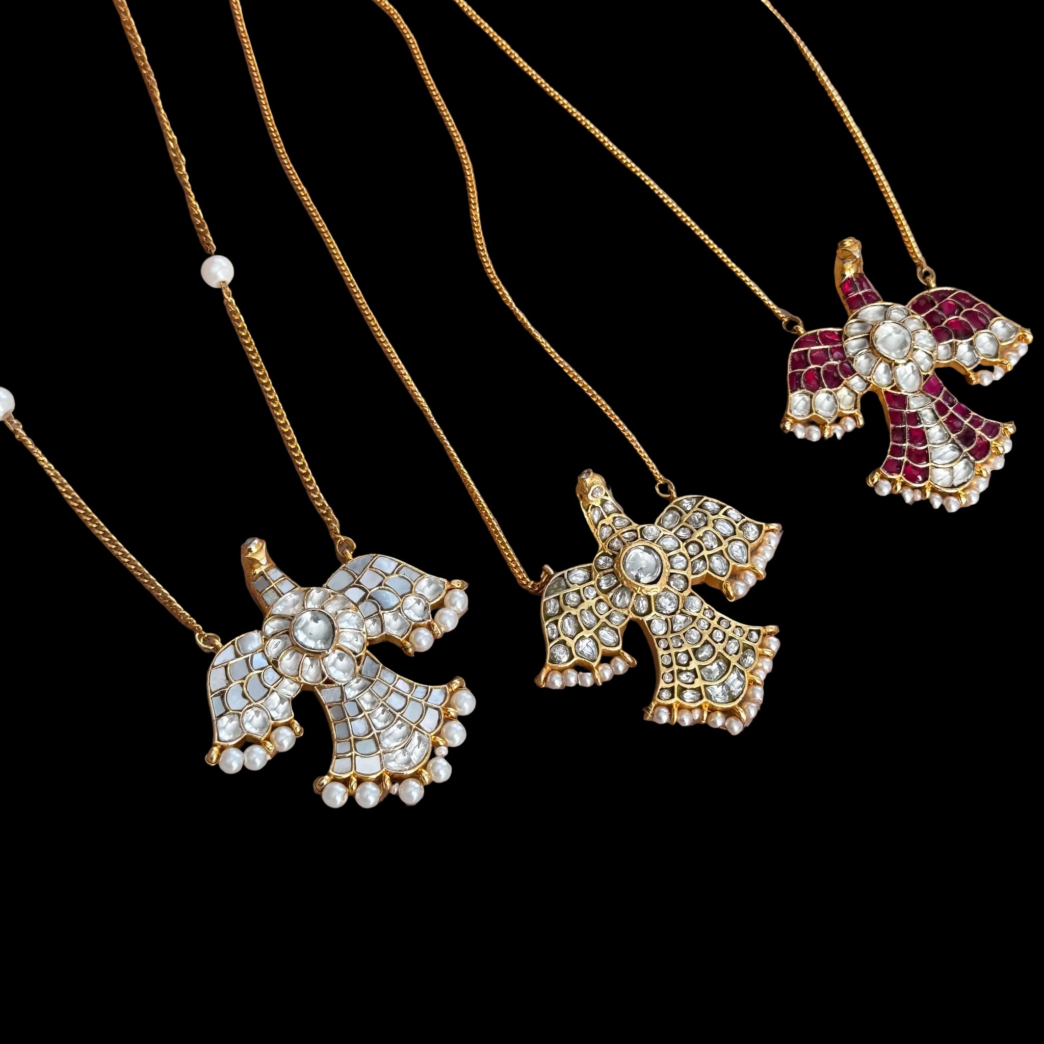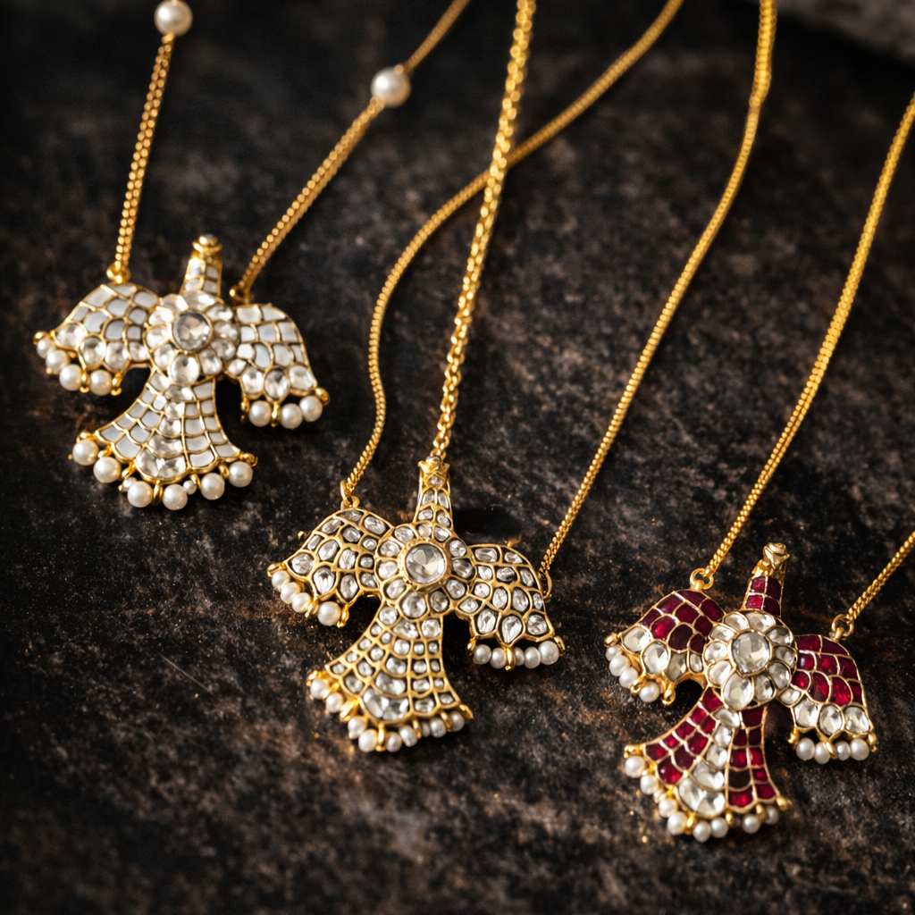 The Falcon Kundan Jadau pendant showcases masterful craftsmanship rooted in traditional artistry. Featuring exquisite kundan stones meticulously set in a jadau technique, this ring offers a striking blend of regal elegance and timeless tradition. Its intricate detailing and rich design make it a refined choice for formal occasions or as a statement piece, reflecting both heritage and sophistication. Durable yet graceful, the Falcon pendant exemplifies enduring beauty for discerning collectors and connoisseurs.