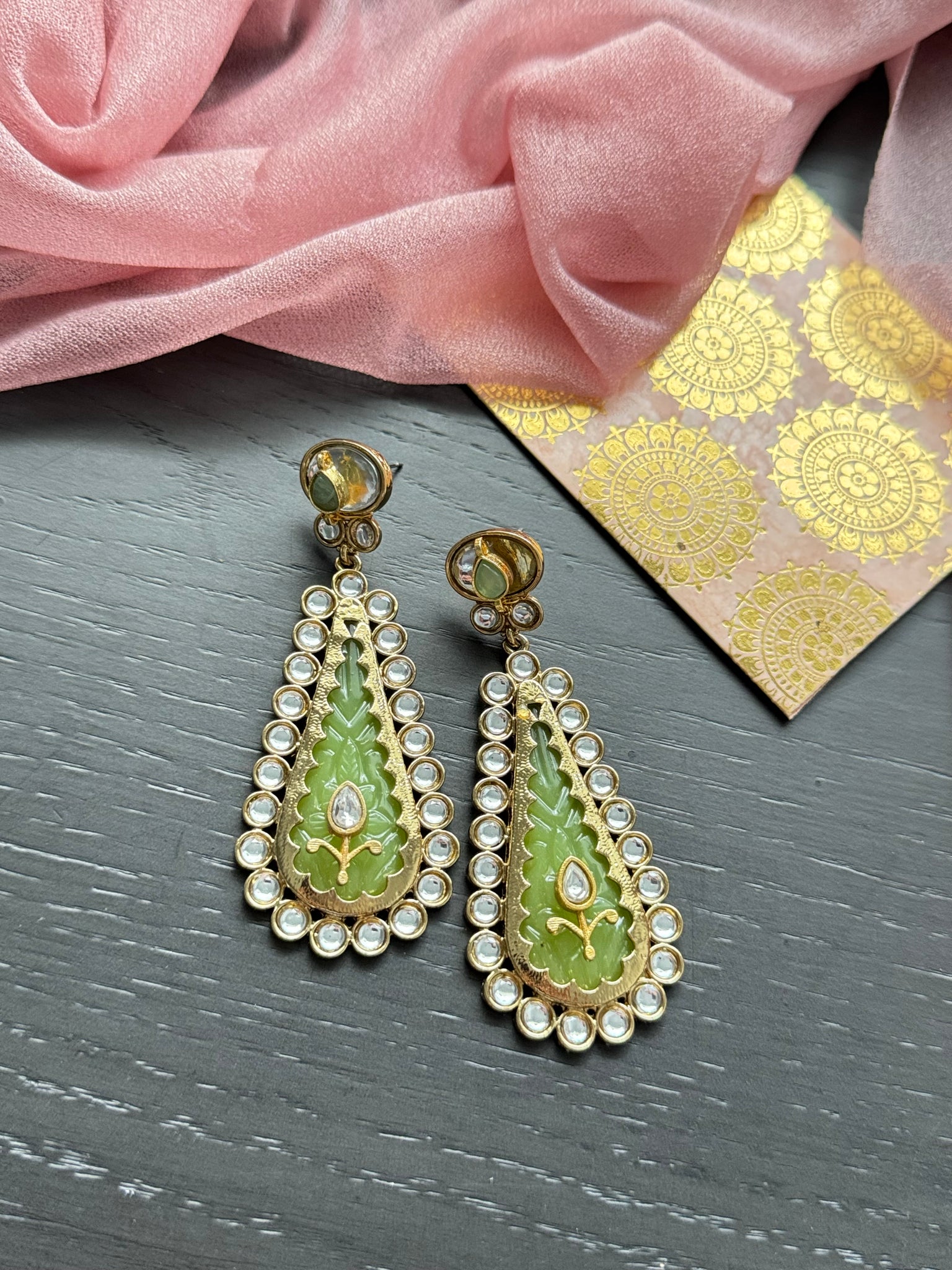 - Material: Metal alloy, kundan, carved stone, beads, pearls, kundan