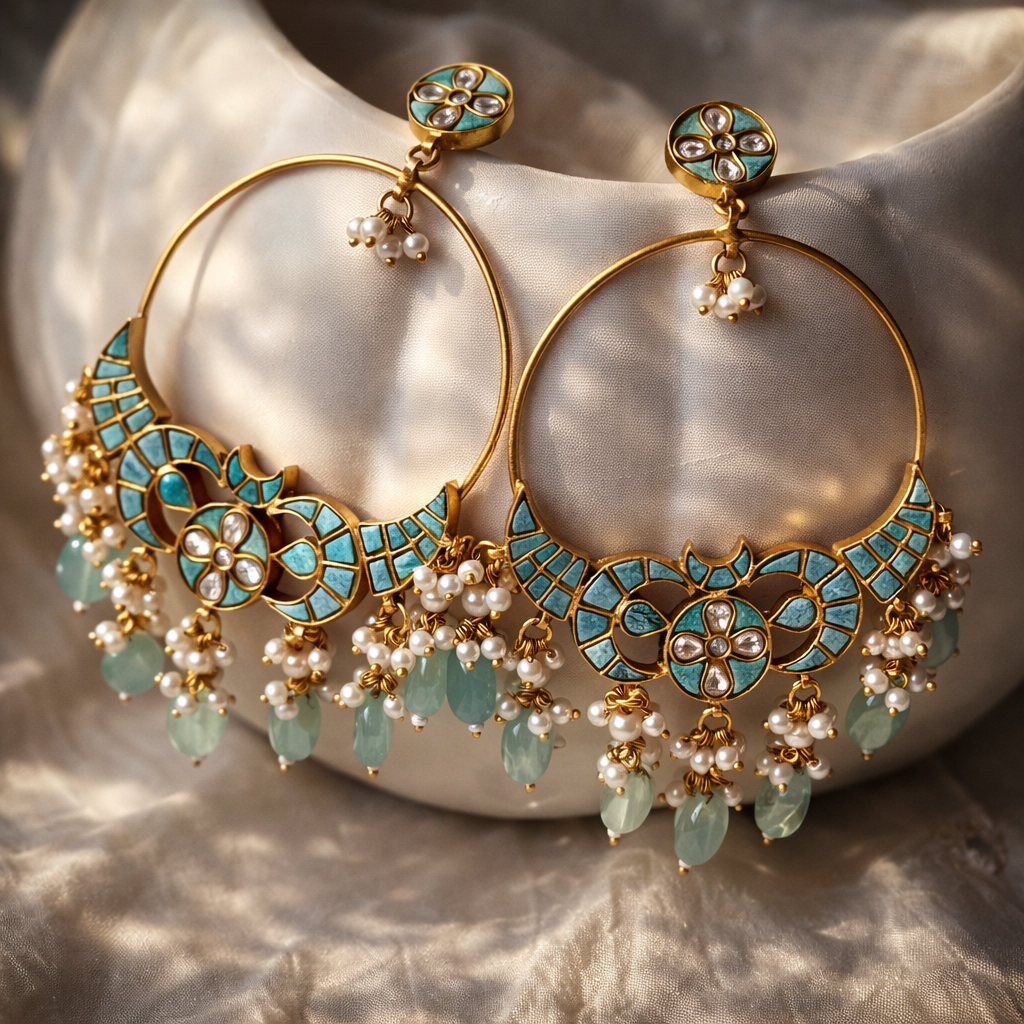 This timeless earring combines the beauty of Pearl with Phiroza- the turquoise stone, creating a versatile piece that effortlessly adds sophistication and glamour to any ensemble. Perfect for weddings, festive celebrations, or any special occasion, it seamlessly blends contemporary elegance with classic charm. Choose to elevate your look with a touch of timeless elegance or a modern twist with this must-have accessory.