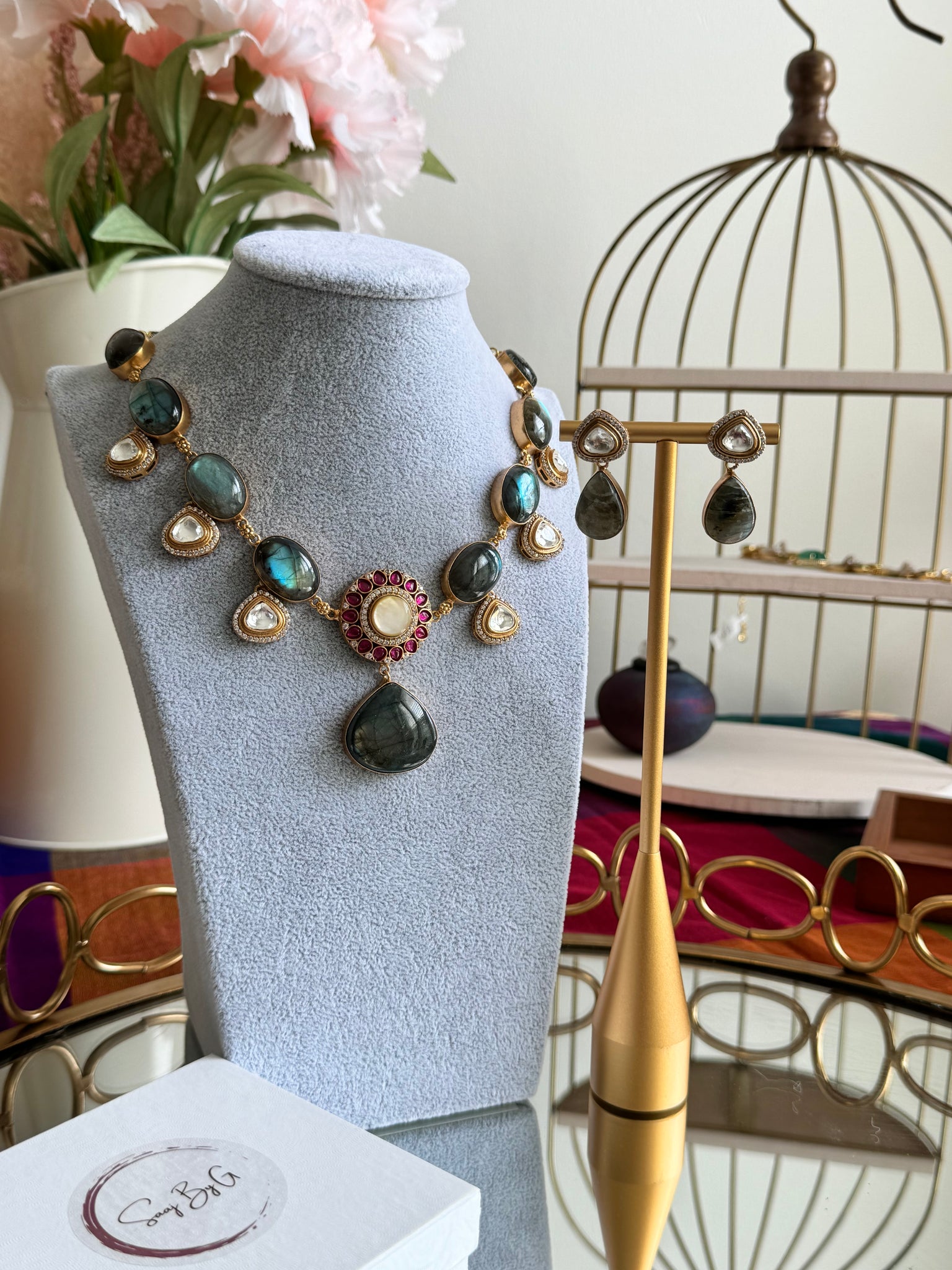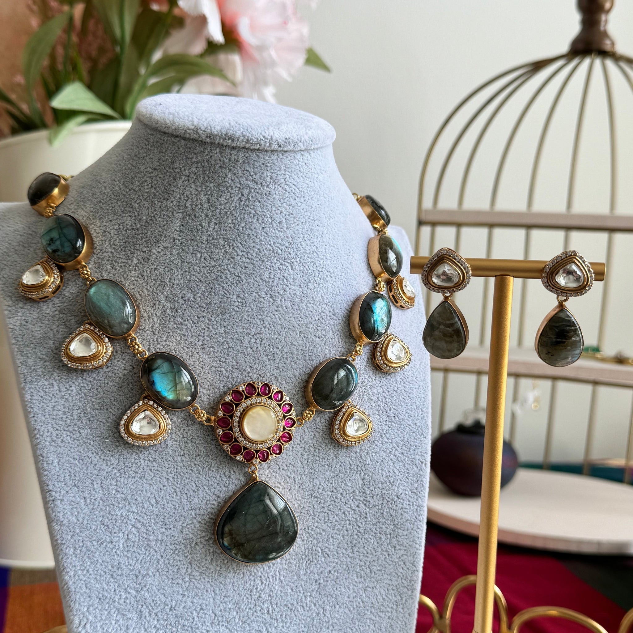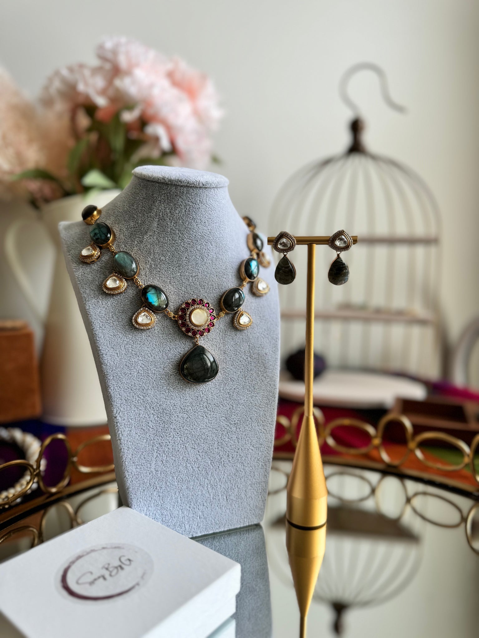 An extremely stunning necklace set, intricately handcrafted with semi precious gemstones. Comes with a dangling ear rings.